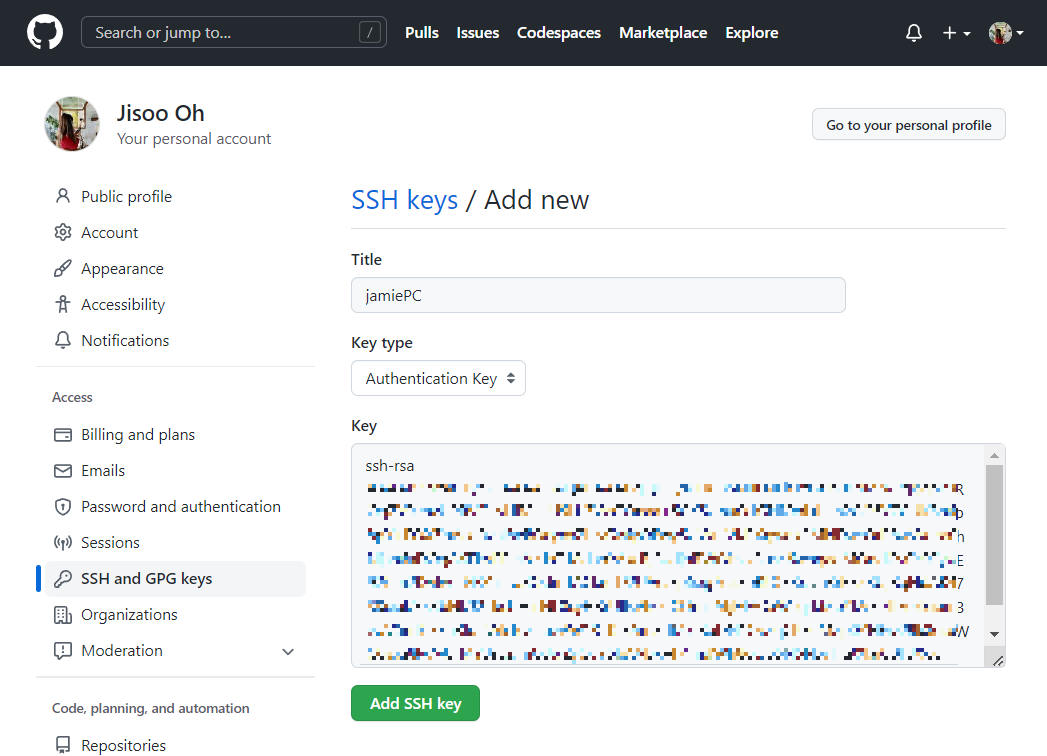 SSH and GPG keys 탭에서 New SSH Key 를 클릭한다