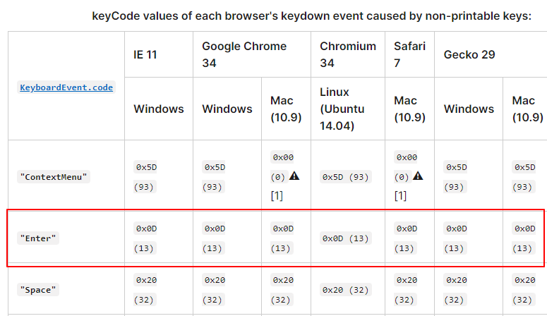 키코드 설명을 보면 enter의 키코드는 13인 것을 알 수 있다.