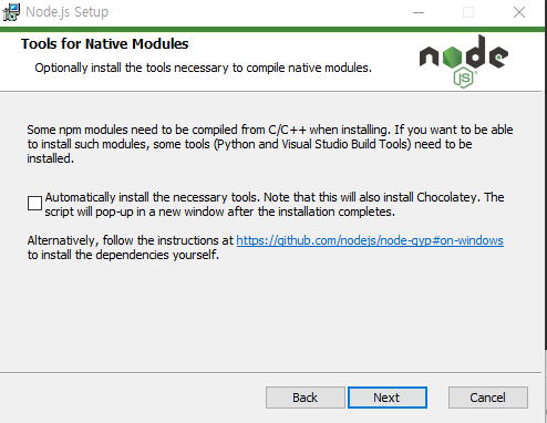 npm 모듈중에 컴파일이 필요한 것이 있을때 필요한 도구(Python, Visual Studio Build Toos)를 자동으로 설치할지 물어 보는 것이다.