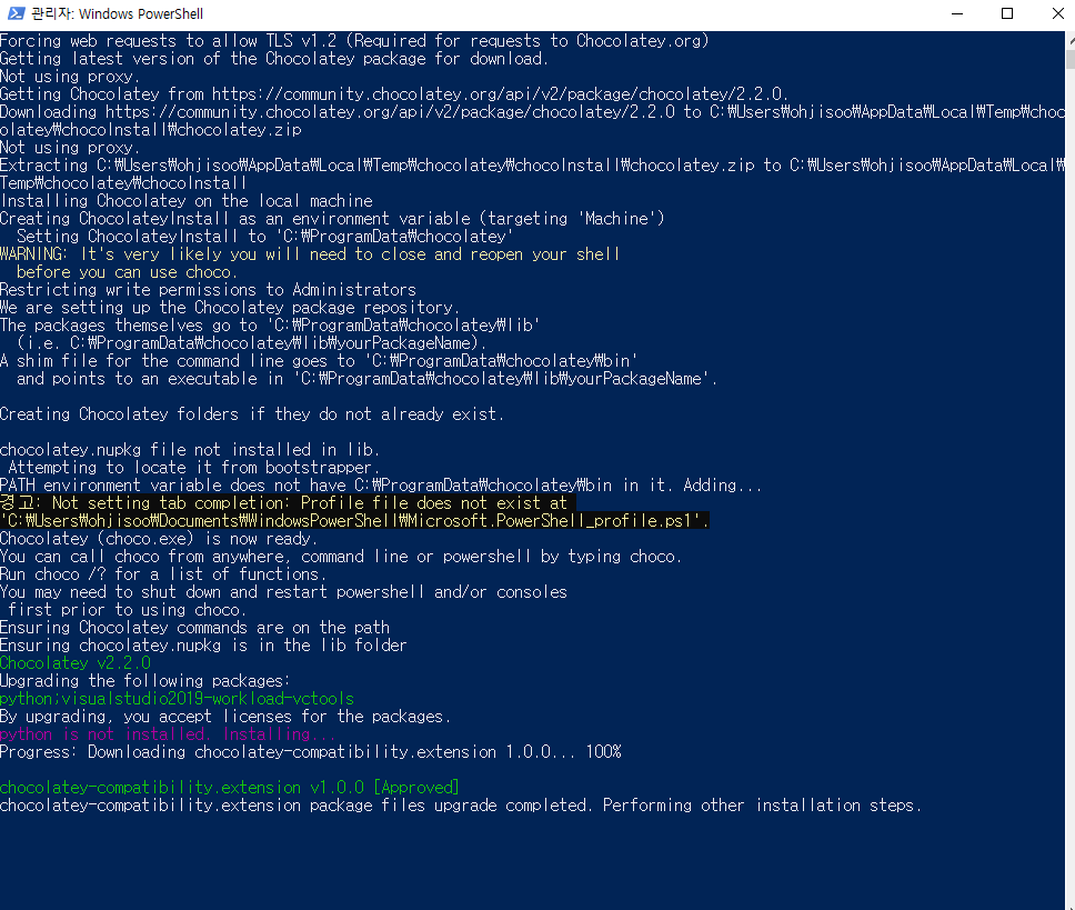 파워쉘이 열리고 네이티브 모듈을 컴파일하는 데 필요한 파이썬과 비주얼 스튜디오 빌드 도구들이 설치된다