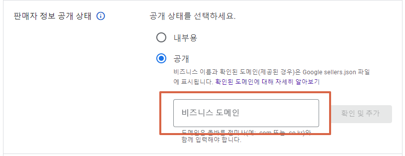 3. 판매자 정보 공개 상태하단에 비즈니스 도메인을 적으면 됩니다.