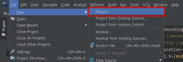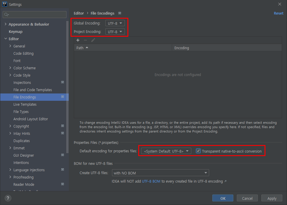 - Editor > File Encodings 선택 그림처럼 설정하고 Apply ➡ OK