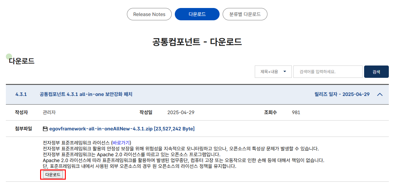 - 표준프레임워크 포털 > 다운로드 > 공통컴포넌트 선택